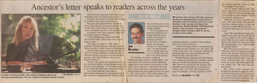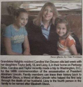 Caroline Van Deusen is a great-great-granddaughter of Elizabeth Lord Dixon, a senator’s wife who was a friend of Mary Todd Lincoln’s. Caroline Van Deusen is a Lincolnphile. She’s been hooked on the 16th president since 2000. She collects books and artifacts about Honest Abe.
