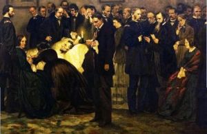 Mary Todd Lincoln is shown trying to comfort her dying husband in Death-Bed of Lincoln painting. It depicts the crowded room in the Peterson House after the president was shot in the Ford’s Theatre across the street in April 1865. The woman sitting next to the bed is Elizabeth Lord Dixon.