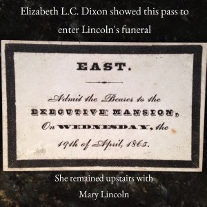 April 19, 1865 was the White House funeral for President Lincoln. Elizabeth L. C. Dixon went to the White House with this admittance pass. Instead of going to the funeral she stayed upstairs and comforted her friend, Mary Lincoln.